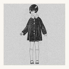 Inspiré des manteaux redingote de la fin du XVIIIè siècle, le manteau anglais fait une entrée remarquée dans la garde-robe enfantine dès les années 1880. La taille marquée au dos par une martingale et le boutonnage par de petits boutons ronds recouverts de velours, les parements du col chemise et des poignets, lui donnent un style intemporel.